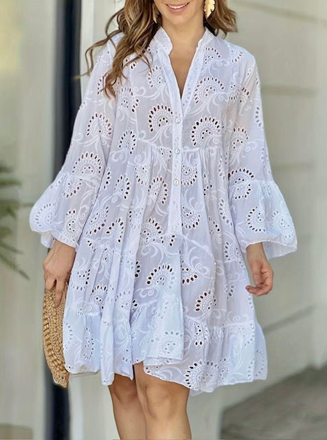 Eyelet Embroidery Notched Neck Long Sleeve Smock Dress |Chic Casual Bohemian