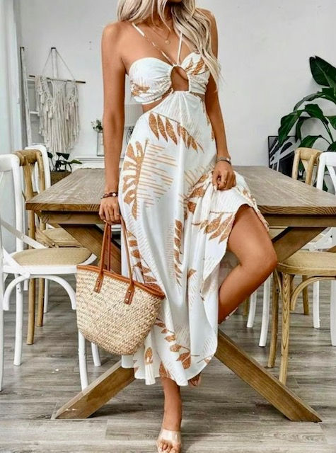 Tropical Leaf Print Hollow Out Backless Halter Maxi Beach Dress