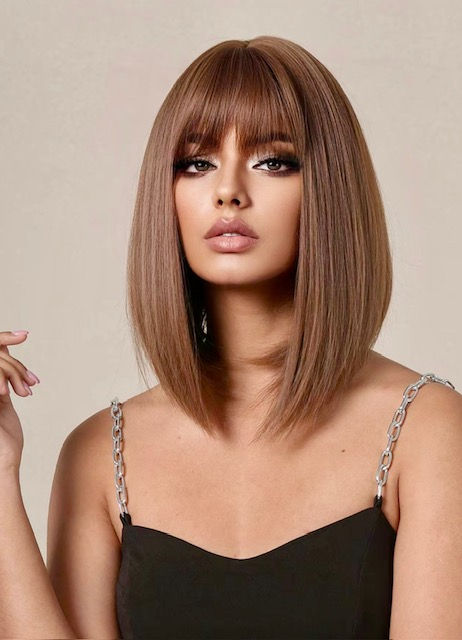12-Inch-Short Brown Straight Wig for Women |Gorgeous Synthetic Wig with Bang